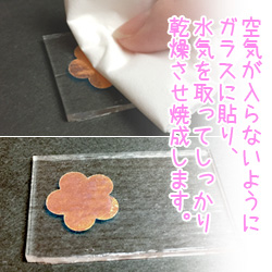 ■ハサミやカッター、クラフトパンチなどでお好きな形状にカットし、1〜2分程、水に浸して台紙から剥がしてガラス等に貼付け、しっかり乾燥させてから電気炉等で焼成してください。